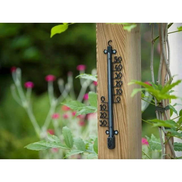 Profiel thermometer voor buiten gebruik van metaal met zwarte epoxy coating.